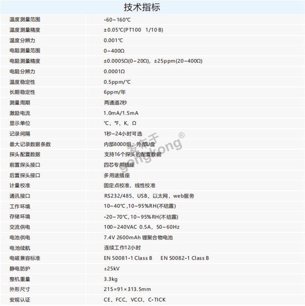 测量性能卓越:搭载高精度测量电路,在PT100 1/10B级别标准铂电阻支持下,温度测量精度达±0.05℃,温度分辨力达0.001℃。