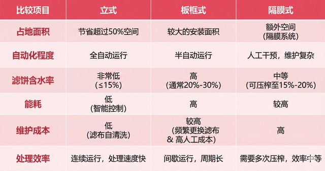 您可以根据生产需求选择合适的压滤机。当然,您选择的过滤设备型号将直接影响生产效率、运营成本和环保合规性。凭借创新的设计,立式压滤机在占地面积、自动化程度、滤饼含水率、能耗及维护成本方面,均显著优于传统的板框和隔膜压滤机。