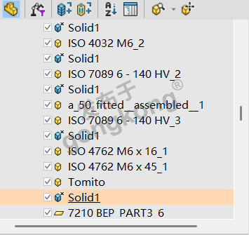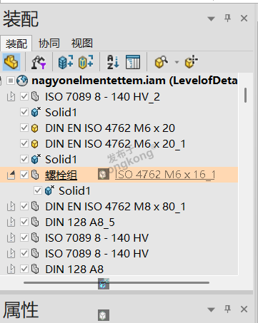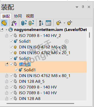4.接下来,在左边装配中鼠标右击顶层装配体,选择创建装配体,将其命名为螺栓组,再在模型中点击螺栓,会在左侧的装配中自动选中零件名称,随后将其拖入螺栓组中。