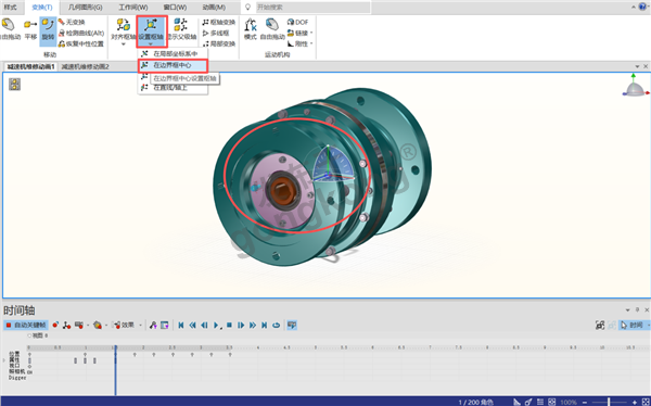 可以看见视频操作框变为蓝色边框,随后在变换中设置其枢纽,选择“在边界框中心”,将时间轴放置在螺栓旋转的第一秒,点击平移。