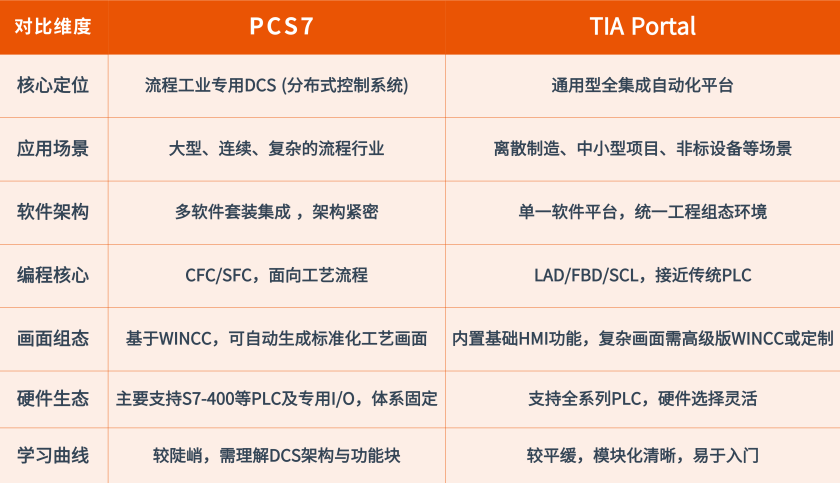 PCS7是流程工业的专业解决方案,应对大型流程工业、批处理与高可靠冗余需求,PCS 7的行业适配与标准化能力更具优势。重在高可靠、高集成、标准化。