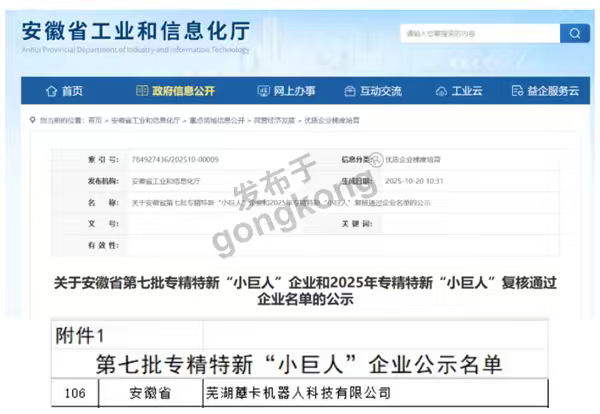 2025年10月20日,安徽省工业和信息化厅正式公布了《关于安徽省第七批专精特新“小巨人”企业和2025年专精特新“小巨人”复核通过企业名单的公示》,藦卡机器人凭借在工业机器人领域的技术创新实力与创新成果,成功荣获这一项国家级权威资质认定。