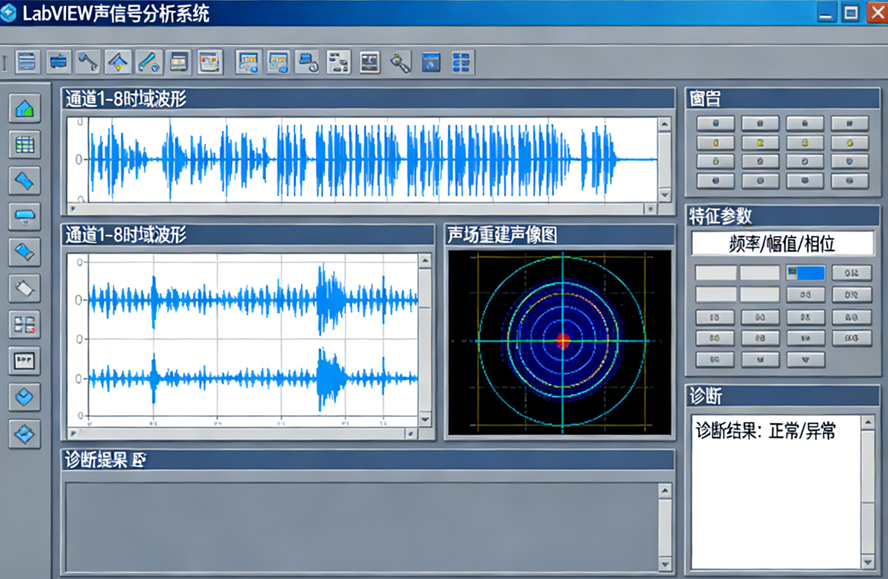 机械故障诊断中,传统振动监测受限于传感器安装条件,声学诊断因非接触优势逐渐成为补充方案,但单通道声信号易受干扰、故障特征提取不稳定等问题制约其应用。本系统基于声成像技术,以 LabVIEW 为开发核心,整合多通道信号采集、声场重建、特征提取与模式识别功能,实现对机械设备的非接触式精准故障诊断,尤其适用于高温、高腐蚀等恶劣工况下的设备监测。