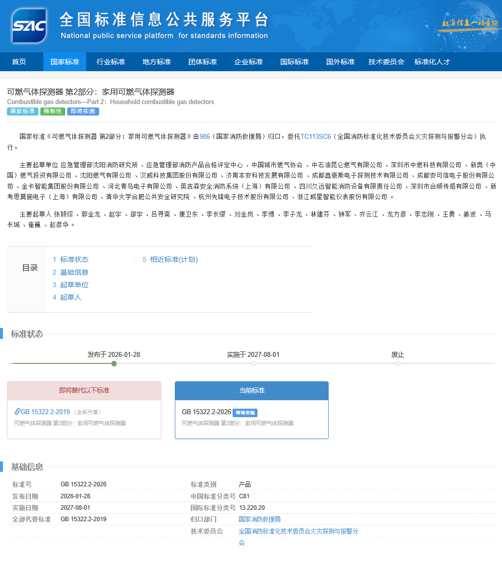 GB 15322.2-2026《可燃气体探测器 第2部分:家用可燃气体探测器》2026年1月28日发布,2027年8月1日实施,替代GB 15322.2-2019;