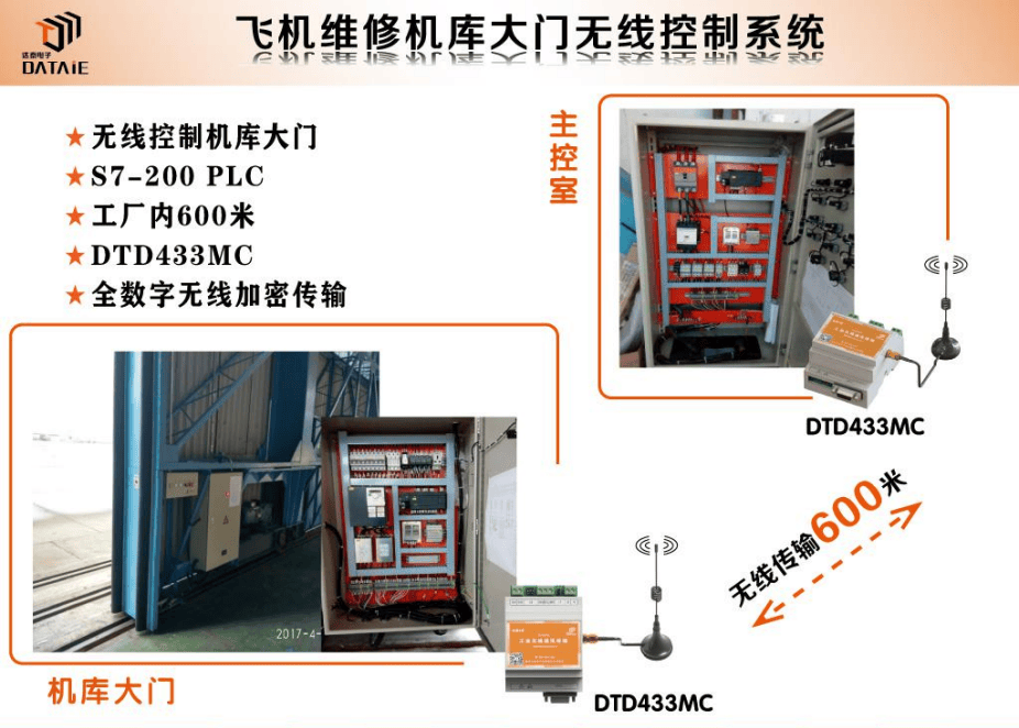 在成都国航维修基地,业主希望实现飞机维修库大门无线控制系统,根据现场情况,PLC无线通讯专家决定在中控室控制柜安装一块DTD433MC——达泰工业级无线通信数据终端,连接S7-200PLC的Rs485接口。另一块DTD433MC安装在机库大门的就地控制柜内,与S7-200PLC的Rs485接口相连接。从而实现对机库大门的无线远程控制功能。当机库门打开或者关闭时,及时启动声光报警装置,警示工作人员勿站在门口及飞机进出道,以确保工作环境安全。