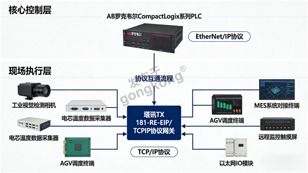 该生产线采用分布式控制与集中调度相结合的架构,核心控制层与现场执行层存在明显的协议差异:产线核心主控系统选用AB罗克韦尔CompactLogix系列PLC,作为整线调度核心,采用专属EtherNet/IP总线协议,负责整线生产逻辑控制、电芯上料调度、模组装配时序协调、PACK成品检测指令下发、产线异常停机管控等核心功能,依托EtherNet/IP协议的稳定性,保障整线调度的可靠性;而现场执行层包含大量TCP/IP协议设备,涵盖工业视觉检测相机、电芯温度数据采集器、AGV调度终端、MES系统对接终端、远程监控触摸屏、以太网IO模块等,这类设备均采用标准TCP/IP协议进行数据传输,负责现场工艺数据采集、视觉定位、状态反馈、生产数据上传等工作。