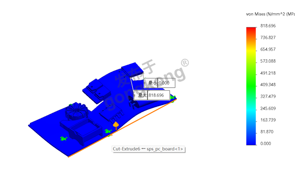 本次基于 SOLIDWORKS Simulation 的电路板随机振动仿真,通过构建含多元器件的 PCB 完整 3D 模型、赋予材料属性、施加固定约束与 NASA 标准 PSD 激励、设置 2% 模态阻尼并求解计算,成功输出了位移与应力响应结果。仿真结果直观显示,电路板最大位移 RMS 值为 2.28 mm,晶体管位置最大 von Mises 应力 RMS 值达 818.7 MPa,显著超出材料许用强度。该仿真流程可为电路板结构优化、元器件布局调整、固定方案设计提供精准数据支撑,助力提升电子设备的抗振可靠性。