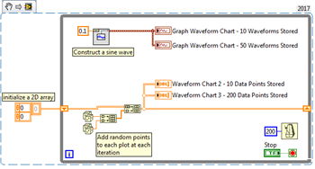 上面的截图来自具有如下程序框图,包括简单生成的正弦波和随机数,并在各种图上绘制它们: