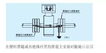 传感器在塑料管道上或在有绝缘衬里的管道上安装,传感器的两端应安装接地环、或接地法兰、或带有接地电极的短管,按下图接地。