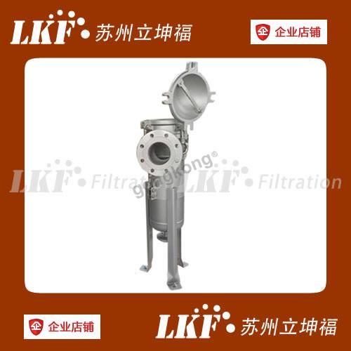 LKF01单袋式过滤器采用侧进底出方式,上盖为铸件凹式,通过管道中的压力将过滤液体介质压入或抽入袋式过滤器桶体,要过滤的液体介质经由不锈钢板冲孔支撑滤篮承托的过滤袋的过滤,产生理想的固液分离达到液体介质被过滤的效果。不同的过滤精度,取决于不同精度的过滤袋。