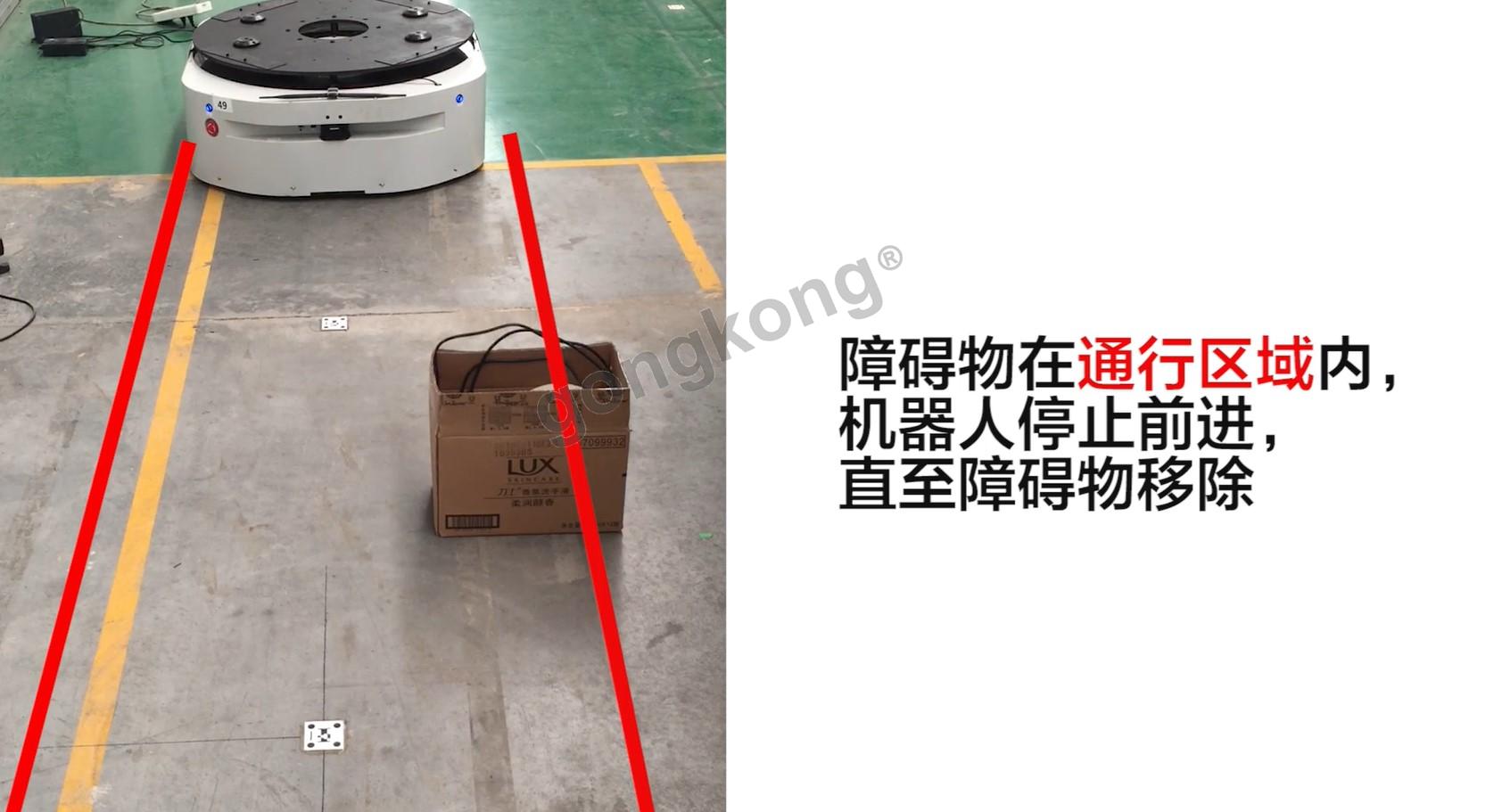 一旦出现障碍物,并进入到预警区域内,雷达就会将距离机器人最近的障碍物的方位信息及时反馈给AGV控制系统,由控制系统控制机器人减速、刹车。而对于那些不在机器人前进区域内的障碍物,即使离的再近,雷达也不会预警,以保证机器人作业的效率。当障碍物离开后,机器人可以继续工作。