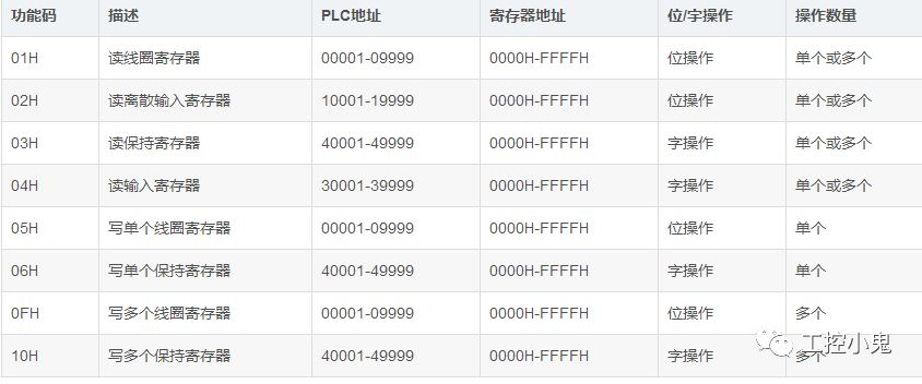 Modbus中常用的功能码有8个,可以分为位操作和字操作两类