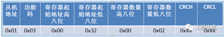 从机地址0x01,保持寄存器起始地址0x0032,读2个保持寄存器