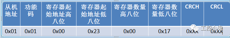 假设从机地址位0x01,寄存器开始地址0x0023,寄存器结束抵制0x0038,总共读取21个线圈。协议图如下:
