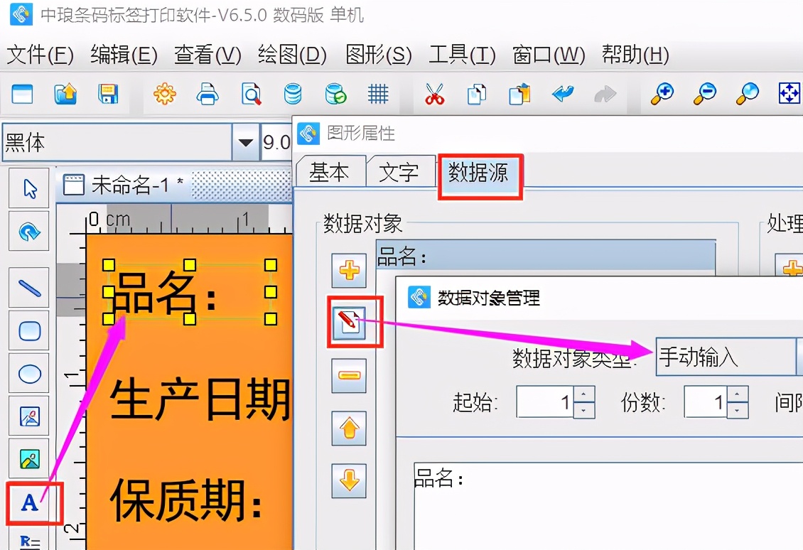 1、点击左侧工具栏中的“A”图标,在画布上绘制普通文本,并双击打开其“图形属性-数据源”窗口,点击左侧“修改”,使用“手动输入”的方法来添加: