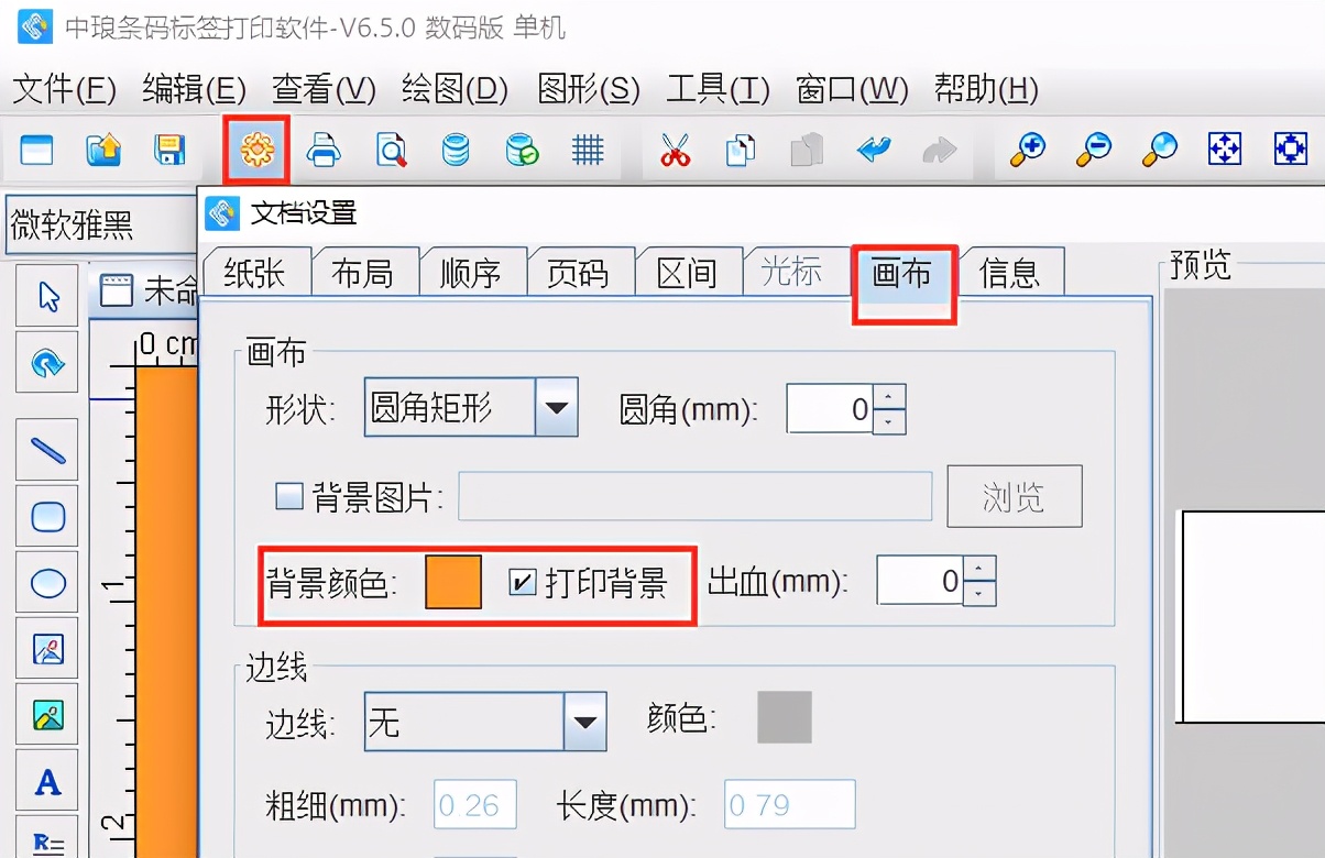 如需修改并打印画布颜色,可点击“文档设置-画布”窗口中的“背景颜色”,修改为需要打印的颜色即可,并勾选打印背景: