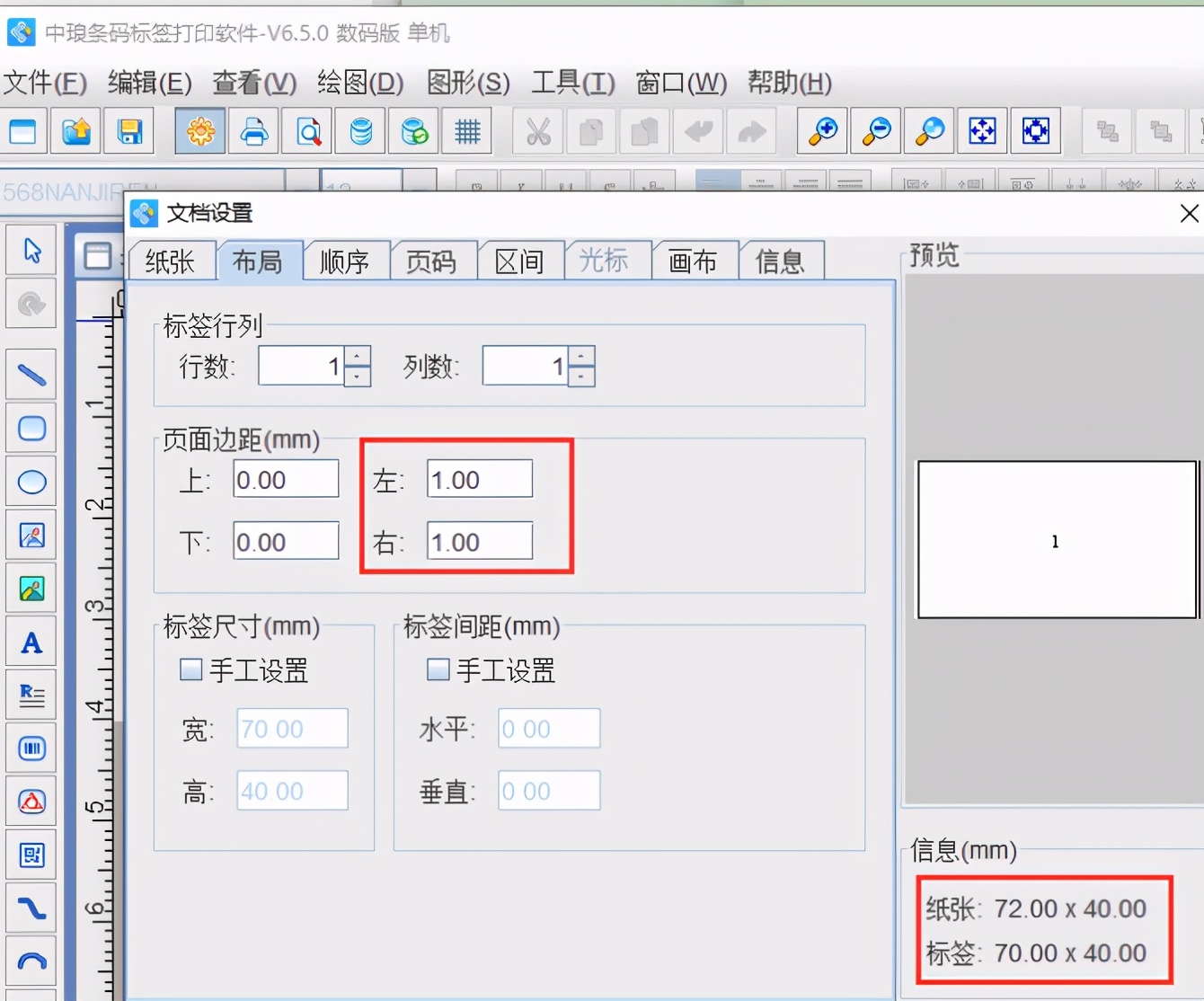 一、新建标签纸 打开中琅标签打印软件,根据标签纸实际尺寸在软件的文档设置窗口,设置纸张大小以及布局参数: