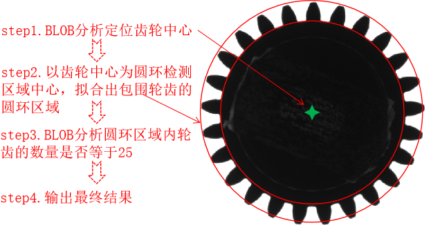 齿轮缺齿是其生产制造过程中的一个重大缺陷,需通过检测技术进行规避。如果使用人工进行检测,不仅会增加人工成本,且检测时容易漏检或者由于注意力不集中而导致误判,因此我们引入了机器视觉检测技术进行齿轮缺齿检测。 一、检测原理 1.检测要求 检测齿轮状产品外边缘上的轮齿是否完整,如有缺失返回“NG”状态,并显示位置信息。若齿轮完整,则返回“OK”状态。