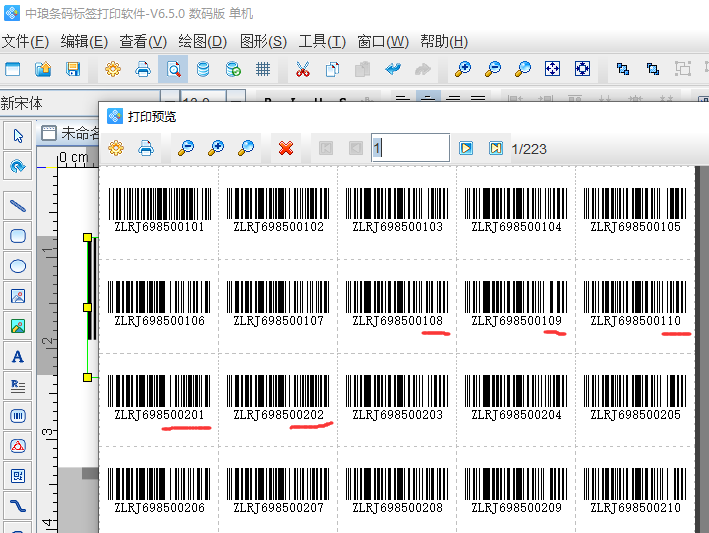 四、打印预览 条码数据设置完毕后,即可点击“编辑-确定”,然后点击上方工具栏中的打印预览,查看生成的数据周期循环效果。从下图可看到,当中间的最后的产品号从1-10之后,批号会自动递增显示下一批次的货品代码: