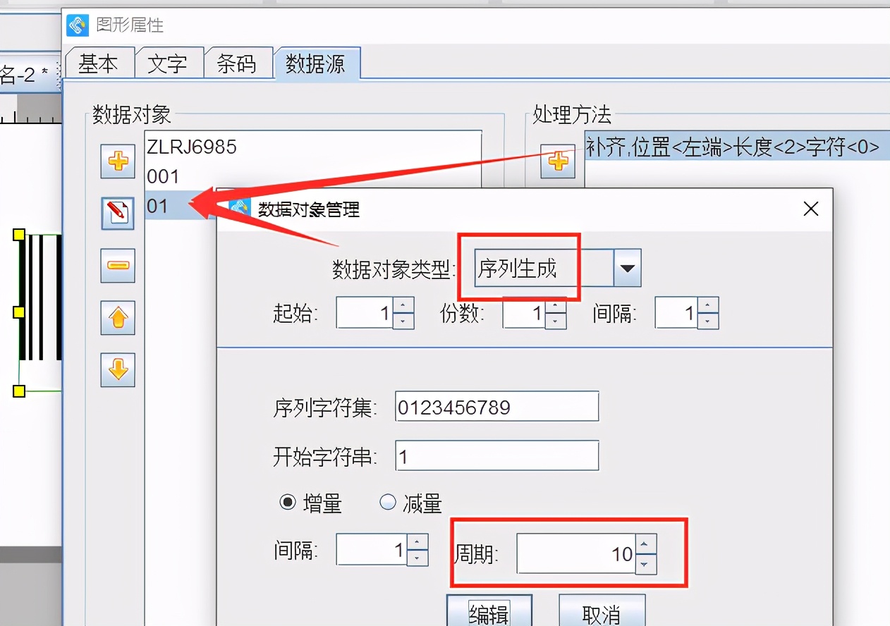 三、添加条形码中产品批次代码 产品批次数据可使用序列生成添加,由于10个为1批,可将份数设置为10,另外可以使用右侧处理方法将条码数据填充相应的长度即可: