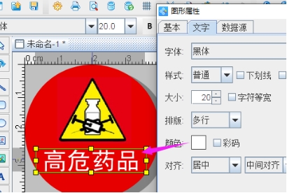 2、添加文字 由于高危药品标签内容为固定不变的, 所以可直接点击左侧工具栏中的“A”,在画布上绘制普通文本样式,并双击打开其“图形属性-数据源”窗口,点击左侧修改,在“手动输入”的输入框中添加文字内容,并点击“编辑-确定”: