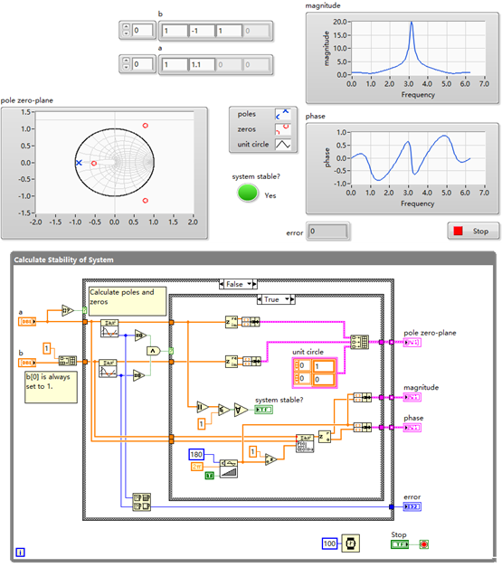 介绍LabVIEW 的Polynomial Roots和1D Rational Polynomial Evaluation VI,通过分析系统传递函数 \(p(z) = \frac{b(z)}{a(z)}\) 的零极点,判断系统稳定性。可修改多项式系数 a、b 观察对稳定性的影响。