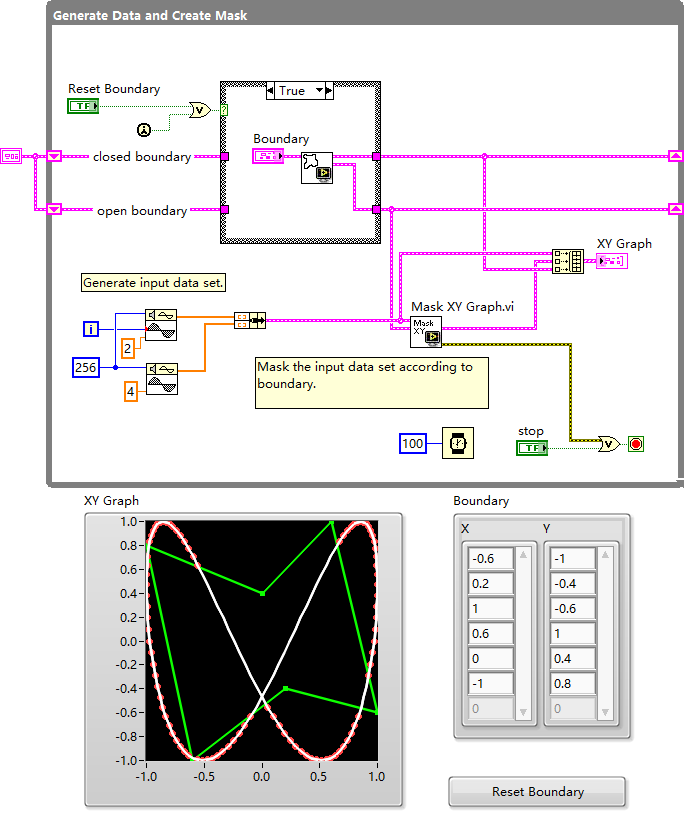 功能:生成输入数据集,并依据设定的边界(closed boundary、open boundary)创建掩码,同时处理边界重置逻辑(首次运行或点击 “Reset Boundary” 时重置),将处理后的数据传递给 Mask XY Graph.vi 用于绘图展示。
