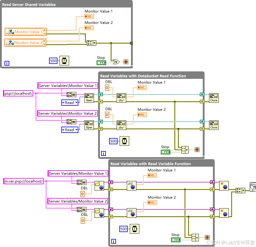 类似功能对比:与使用 DataSocket API 读取相比,变量节点方式更简洁,无需编写复杂的 API 调用代码,适合简单的数据读取场景;但在需要更灵活的网络数据交互(如与非 LabVIEW 程序通过 DataSocket 通信)时,DataSocket API 更具优势。