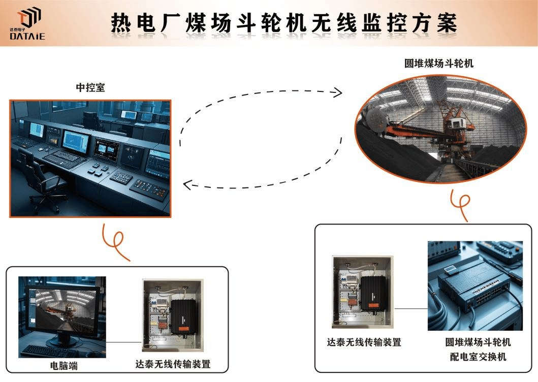 河北某热电厂为实现煤场斗轮机的监控与数据通信,采用工业无线网桥来部署无线监控系统。发射端集中采集斗轮机上8个摄像头的实时视频信号以及PLC数据,接收端接收发射端信号并将数据传送至电脑显示。整个系统采用全数字加密传输方式,确保了监控信号和数据稳定传输。监控人员就能够及时掌握斗轮机的运行状态,并根据需要进行操作调整。