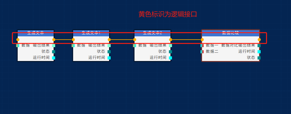 GraniStudio 6.0 平台画布设计器算子模块接口分别有: 逻辑接口、数据接口。逻辑接口主要用来串接算子之间逻辑关系,以及执行顺序。算子之间的逻辑接口连接用黄色线表示。执行顺序从逻辑起点算子,顺序向下执行。