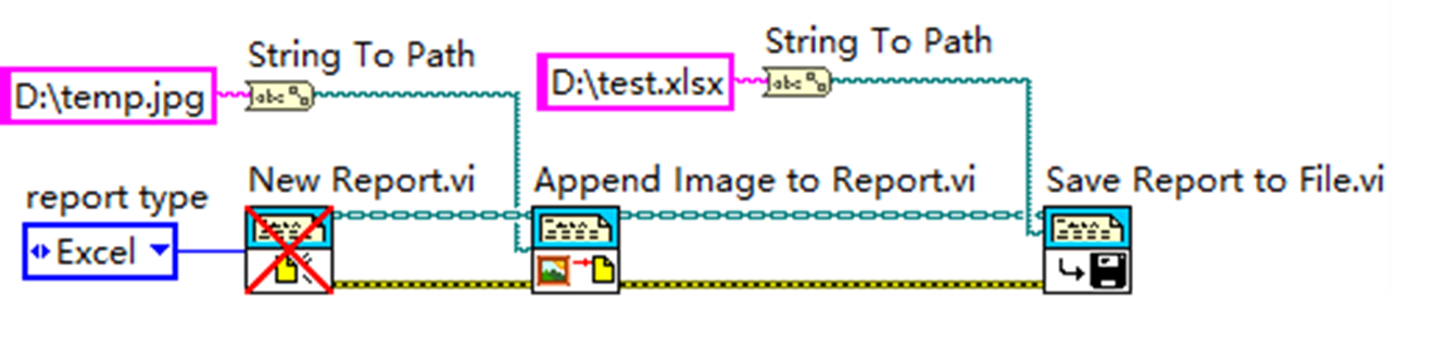 最终通过 “Save Report to File.vi” 将包含图片的报告保存为 Excel 文件(D:\test.xlsx)。