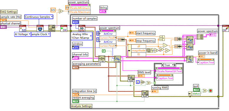 通过 DAQ 硬件采集振动传感器信号,实现时域 - 频域转换、功率谱分析、RMS 电平及运行 RMS 计算,支持游标选频带测带内功率,是工业振动监测、设备健康诊断的核心工具,需匹配加速度计等传感器与 DAQmx 兼容硬件,适用于连续振动数据的实时分析场景。
