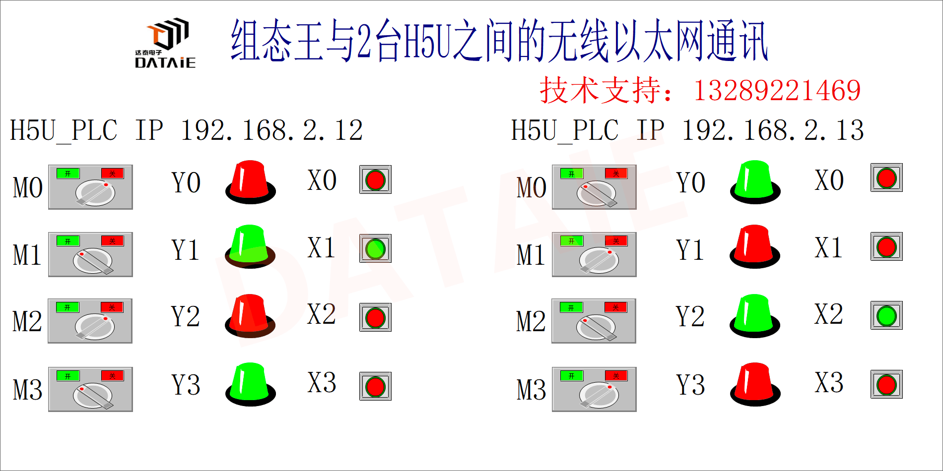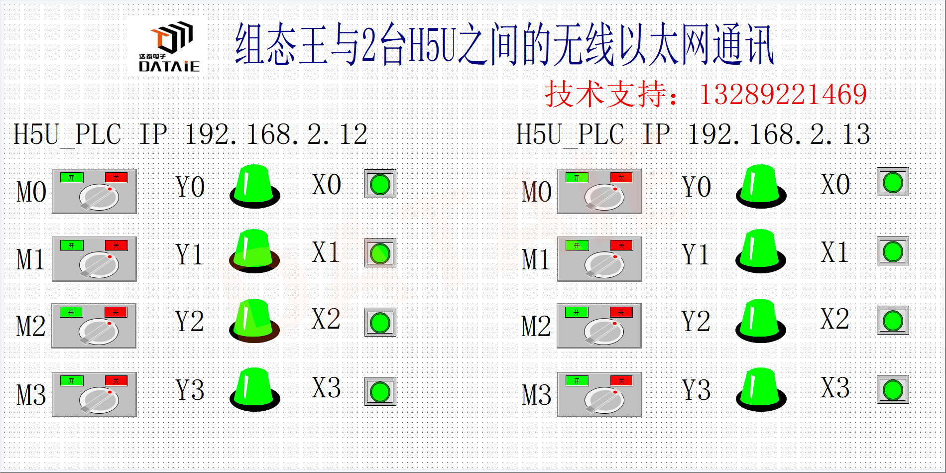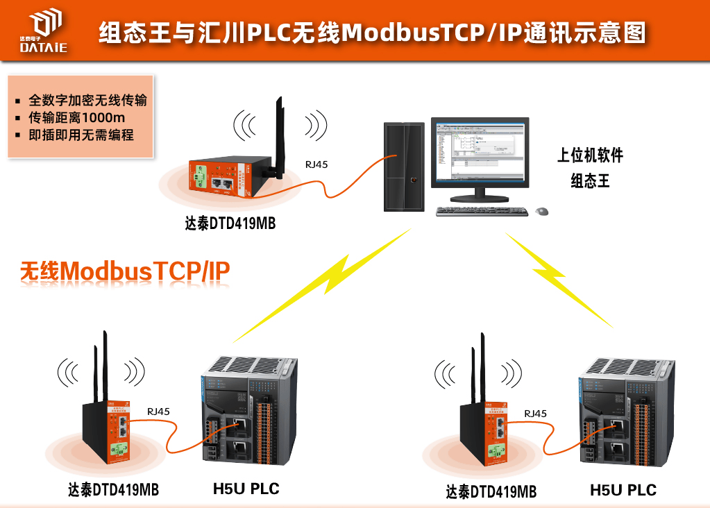 本方案以汇川H5U PLC为例,验证测试组态王与汇川PLC之间在ModbusTCP/IP通讯协议下,快速实现自组网无线通讯的解决方案。在本方案中采用了达泰日系PLC无线通讯终端——DTD419MB,作为实现无线通讯的硬件设备。无线方案示意图 ▼