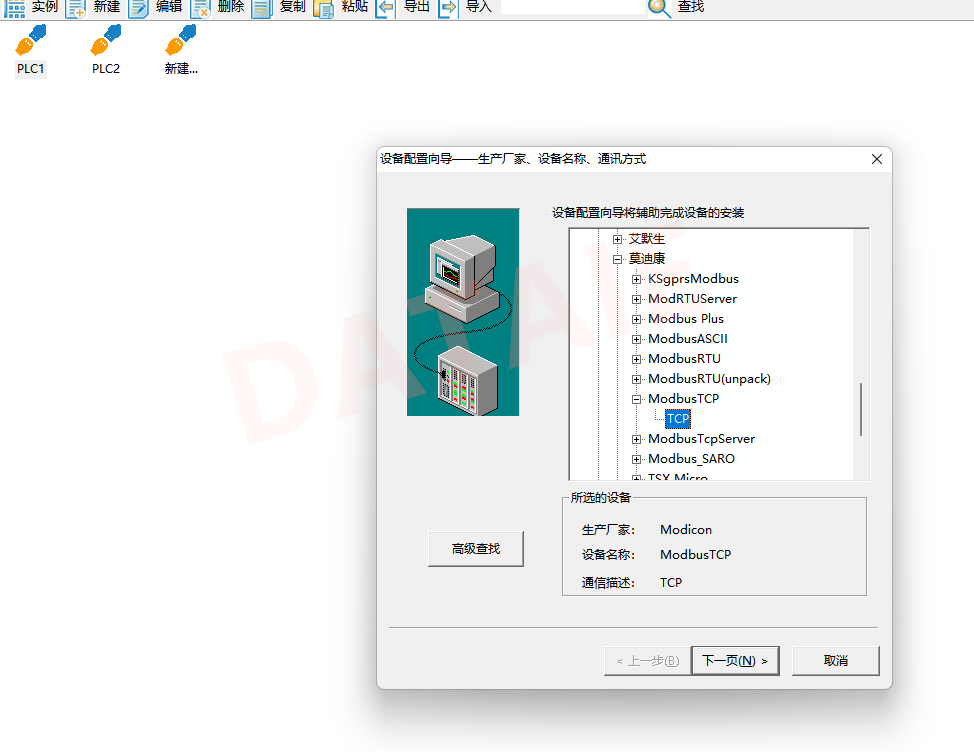 2. 添加1台PLC,以及相关协议