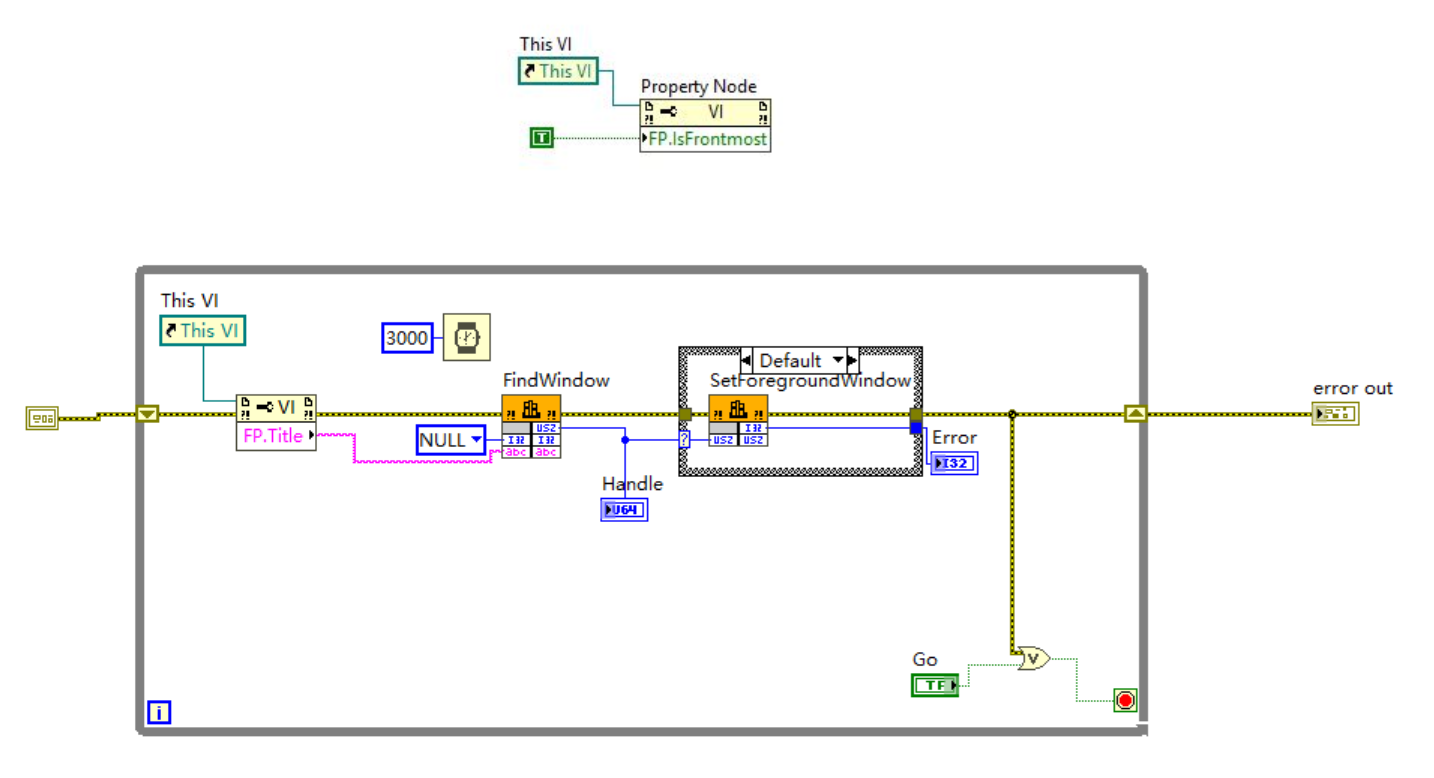 拖入 While Loop,将上述 “获取句柄 + 置顶” 逻辑放入循环内。