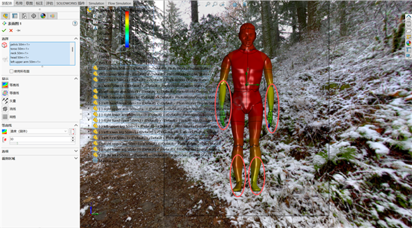 本次基于 SOLIDWORKS Flow Simulation 的人体寒风热仿真,通过搭建假人 - 风场耦合模型、配置基础代谢产热与边界条件、划分网格并求解计算,成功输出了切面速度与表面温度的核心数据。仿真结果直观显示,手部、脚部及大腿中部因风速较高导致热量流失加快,温度显著偏低,与现实中人体冬季户外的失温特征高度吻合。该仿真流程可为防寒装备优化、户外保暖方案制定提供精准的技术数据支撑。