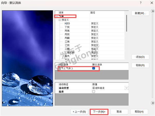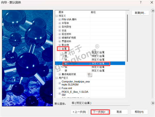 6、在流体材料板块,选气体类别的空气以及固体金属中的铜,其余保持默认设置,点击下一步。