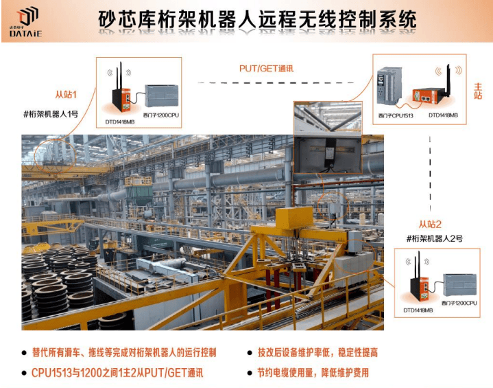 济南某铸造厂利用无线通讯实现砂芯库桁架机器人远程无线控制系统。在现场,技术人员采用3块DTD418MB来代替所有滑车、拖线等完成对桁架机器人的运行控制。在固定端主机设备商的西门子S7-1500 PLC上搭载一块DTD418MB作为主站。然后在两台桁架机器人上的西门子S7-1200 PLC上分别搭载一块DTD418MB作为从站,最终实现砂芯库桁架机器人远程无线控制系统。