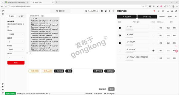 • 可视化强:浏览器点击按钮后,网页日志和板载 RGB 会同时变化,反馈非常直观