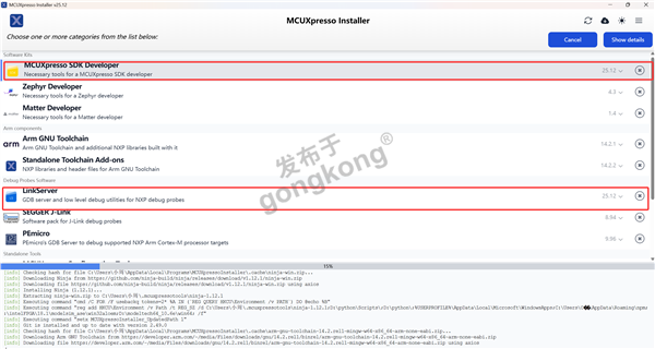 切换到 MCUXpresso 视图后,在 Quickstart Panel 里打开 MCUXpresso Installer,按向导安装依赖组件。
