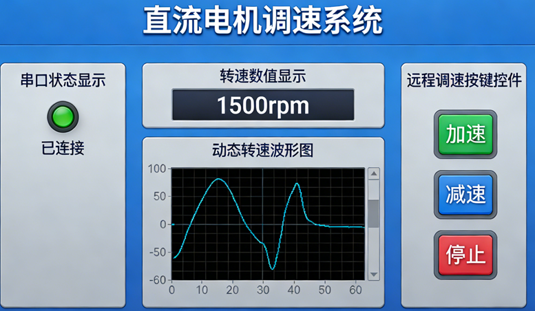 远程控制模块:在界面中设置虚拟按键与数值输入控件,实现电机启动、停止、正反转、转速设定的远程操作,工程师可直接在电脑端修改 PWM 占空比参数,下发至单片机完成转速调节,无需现场操作下位机,提升操作便捷性。