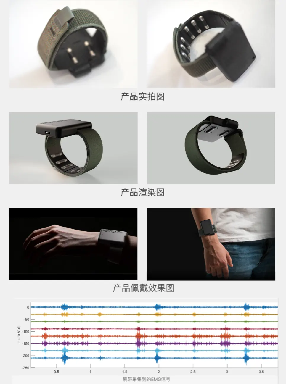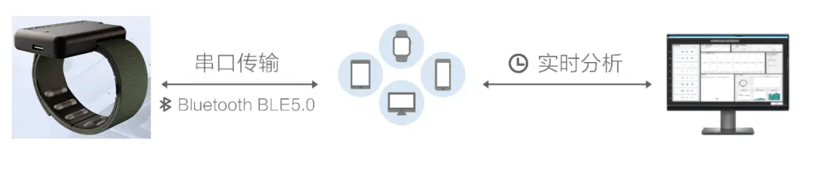 本产品使用进口生物电芯片实现8个通道的EMG肌电信号采集,同时融入了6轴陀螺仪,最终通过BLE蓝牙或者有线将数据实时发送至匹配的蓝牙接收器。这使得腕带可以精准采集前臂肌肉电位与肢本运动信息进行自然手势识别,为后续的动作手势识别提供良好的基础。EMG肌电采样精度为24bit,采样率250Hz~2kHz,能够容纳更大的信号动态范围。使用本腕带可以实现对大动作和小动作的训练与识别,同时也支持导出原始数据进行二次开发。