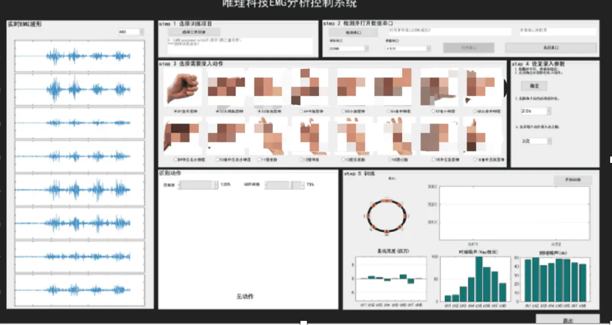 基于windows平台,可对腕带数据进行采集和训练。支持任意手势动作的快速模型训练,训练完成后可以在软件中进行手势实时识别,并可将识别结果设定串口进行发送,用于控制各种外设。