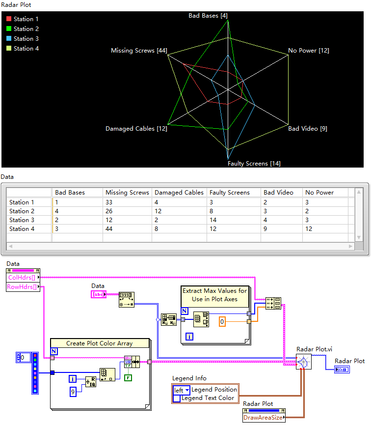 功能:从颜色常量中为每个要绘制的行(组)分配颜色,作为 Radar Plot VI 的绘图颜色输入。