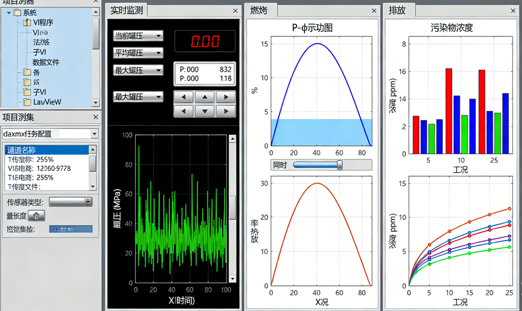 LabVIEW 开发内燃机缸压采集与分析系统,通过整合数据采集卡与传感器,实现缸压、曲轴转角信号采集及燃烧性能、排放等多维度分析,成功支撑 HCCI 燃烧方式实验验证,为内燃机节能与排放优化提供技术支撑。